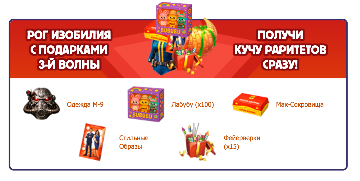 Рог изобилия — это предмет, который содержит в себе все раритеты текущей волны подарков сразу в максимальной модификации и является желанным призом для любого игрока!